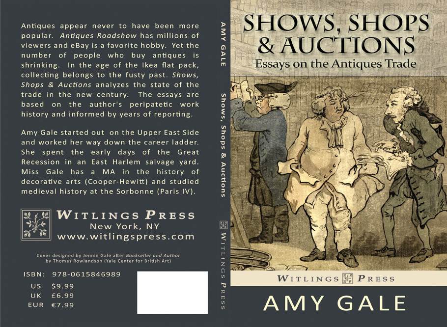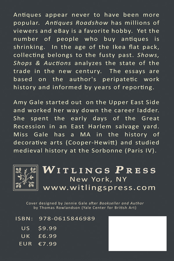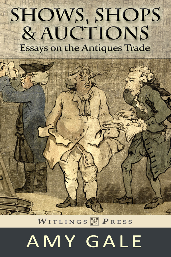 Design and creation of book cover for "Shows, Shops & Auctions, Essays on the Antiques Trade" by Amy Gale. Published by Witlings Press. © Witlings Press